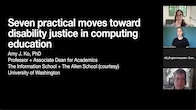 Jul 14, 2025Amy J. Ko, University of WashingtonSupported by: AccessComputingAmy will discuss how, employing a disability justice lens and embracing its intersections with other systems of oppression around race, gender, and class, she strives to apply a Universal Design in Learning (UDL) framework to her teaching. She'll share her philosophy on UDL and share 7 heuristics she has developed for accessible teaching in computing. NOTE: Due to Zoom-related screen-sharing in the first several minutes of the presentation, the presenter's first two slides have been statically laid over the screen share, and discussion between the presenter and host regarding tech difficulties interrupt the presentation briefly around the 00:05:45 mark.