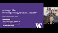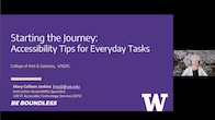 May 20, 2025Mary-Colleen Jenkins, UW ATSSupported by:In this workshop, after establishing a shared understanding of digital accessibility, Mary-Colleen addresses a key question faculty ask when creating a plan to make their content accessible: Where should I start? She helps participants establish a starting point in three steps: an informal audit of tools and workflow; thinking about the "First Next Thing;" and setting up a cleaner, leaner Canvas Course. During three guided activity sessions participants taking the time to reflect on where they are starting from as a way to start developing a workable accessibility plan for their content. Finally, she shared tips on how to prioritize content to focus on first.